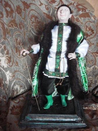 Материалы: голова, руки, сапоги-Paperclay(самоотвердевающий пластик), волосы: тресс. Ткани: парча, бархат, мех норки, атлас, декор бисером. Роспись лица: акрил.
